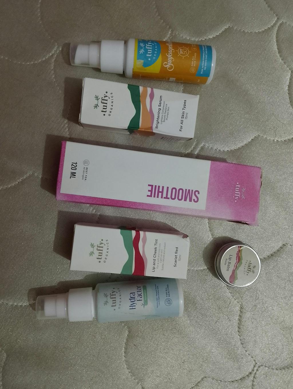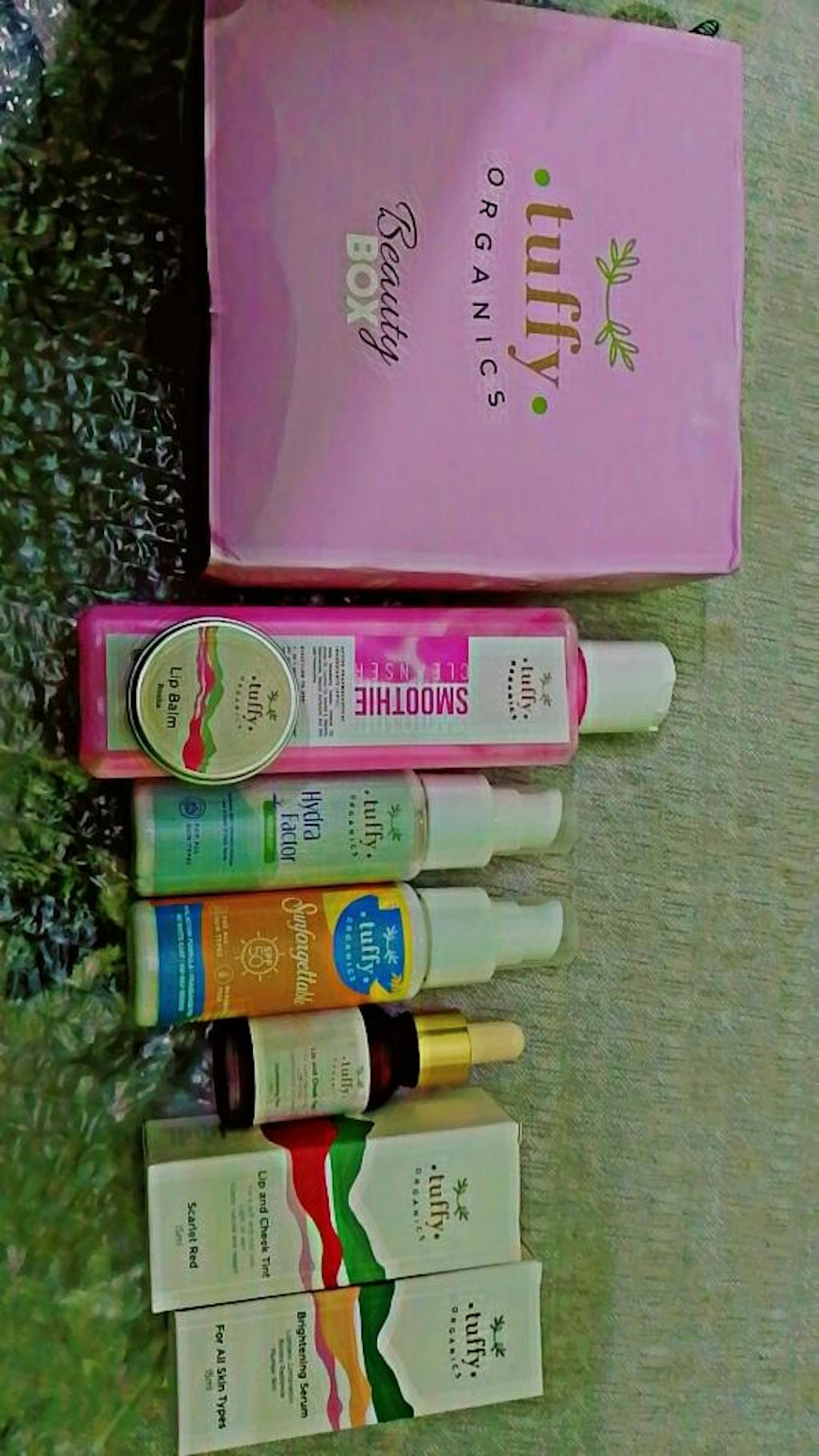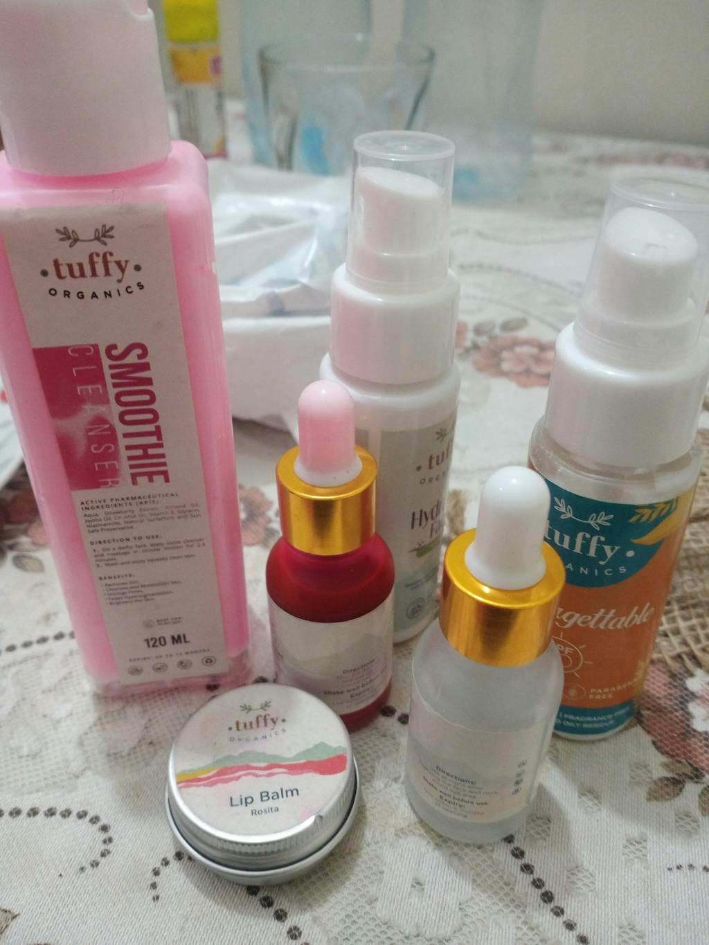 my first experience with tuffy organics didn't disappoint me and upto now I reached a satisfaction level already so far i can feel change in skin by using serum .no words for lip balm the Rosita one its just superb and tints too they blend well nd highly pigmented.as for sunblock it quickly absorbs on skin with out any greasy effect or white cast.nd last not least smoothy cleanser and moisturizer r best . overall loved the products nd looking forward to it